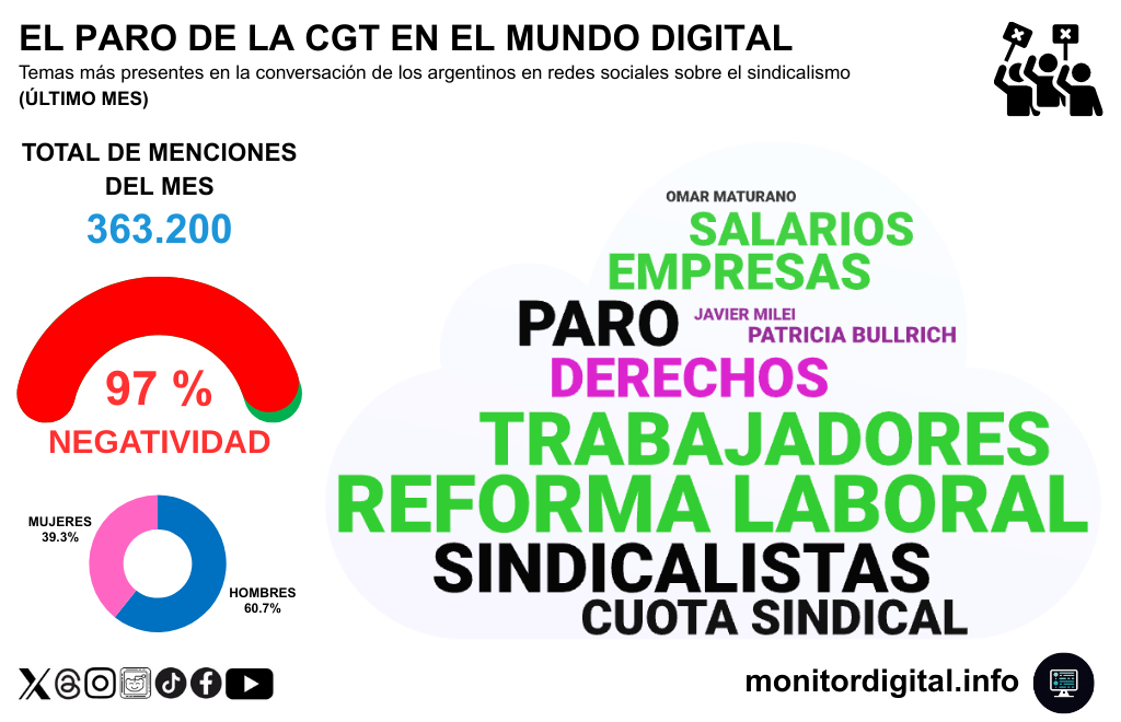 El análisis del último mes de conversación en redes sociales sobre el sindicalismo registró 363.200 menciones y una negatividad por las nubes del 97%.