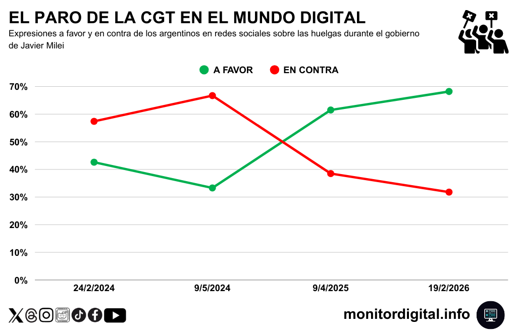 En el terreno de la opinión online de los argentinos sobre las huelgas realizadas desde que La Libertad Avanza es gobierno, los cuatro paro convocados pasaron del rechazo a la aprobación.