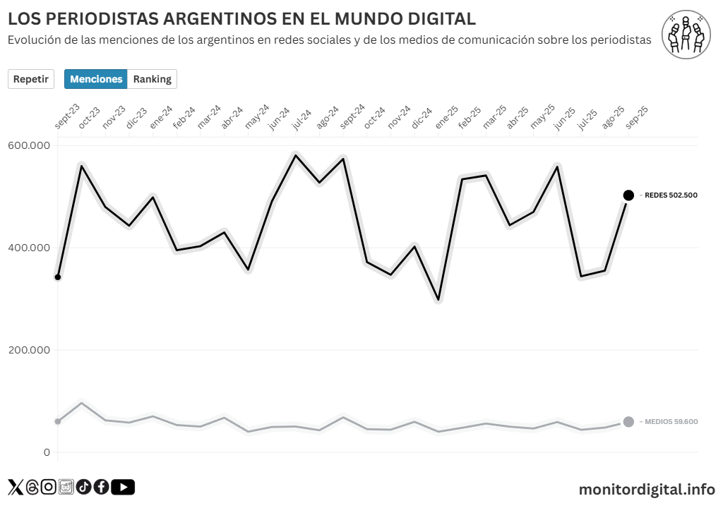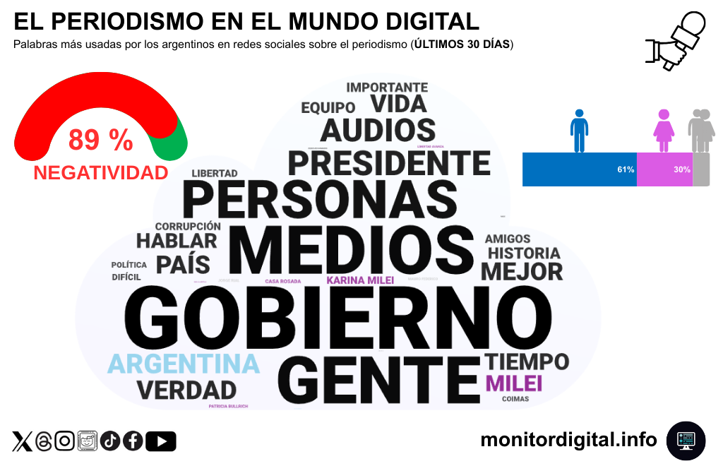 Además, el perfil de la conversación marca un predominio masculino: 61% de las menciones son de varones frente a 30% de mujeres, lo que sugiere que el enojo contra el periodismo circula más en comunidades digitales con sesgo masculino.