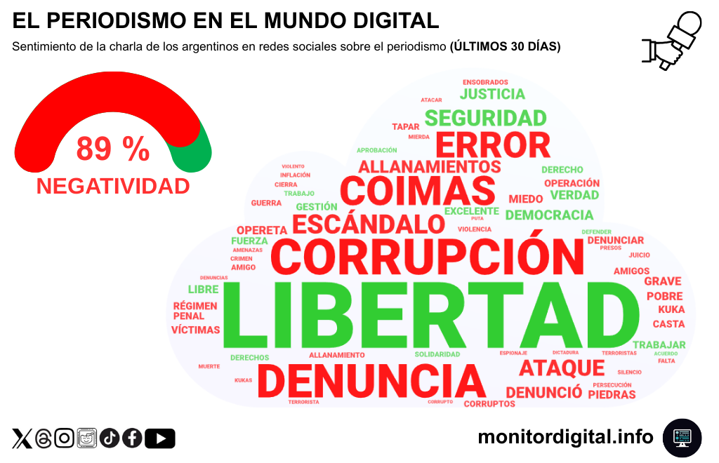 La negatividad alcanza el 89% de las menciones, un registro inusualmente alto que posiciona a los periodistas entre los actores sociales más cuestionados en la conversación digital.