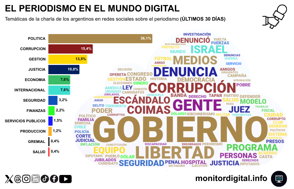 También aparecen justicia (10,8%) y economía (7,6%), lo que indica que las críticas a los periodistas se disparan según su tratamiento de causas judiciales y de datos que surgen de la crisis económica.