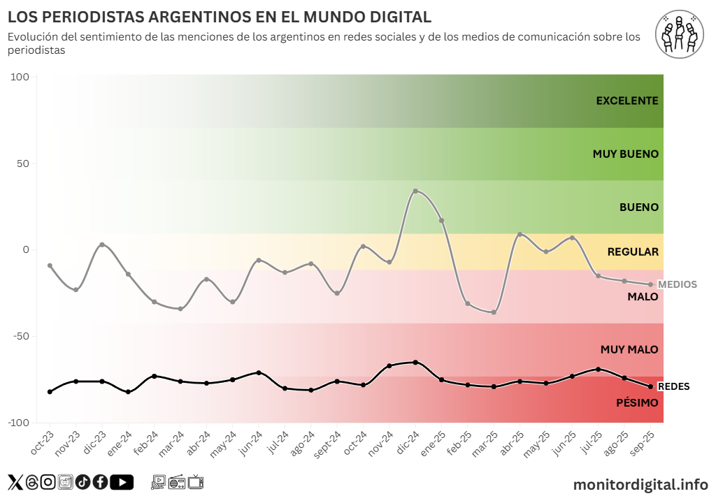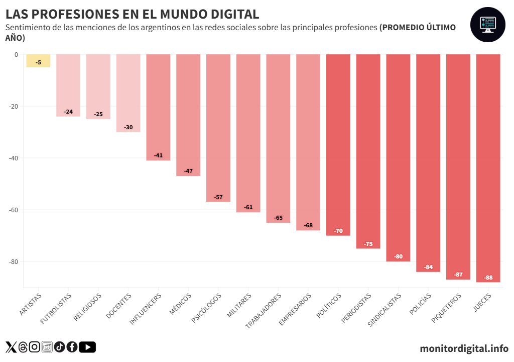 - Sólo los superan en rechazo jueces (–88), piqueteros (–87), policías (–84) y sindicalistas (–80). Es decir, el periodismo se percibe tan negativamente como los sectores con peor reputación digital del país.