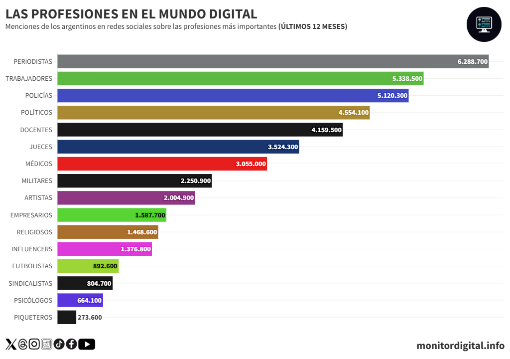 - Los periodistas lideran la conversación digital: con 6,28 millones de menciones en el último año, superan a trabajadores (5,33 millones), policías (5,12 millones) y políticos (4,55 millones).