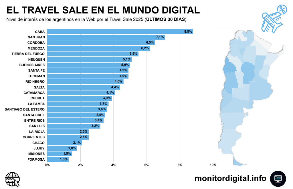 El ranking de las búsquedas en Google por el Travel Sale 2025 ubica a CABA al frente (8,8%) de las consultas, seguido por San Juan (7,1%), Córdoba (6,5%), Mendoza (6,2%) y Tierra del Fuego (5,5%).