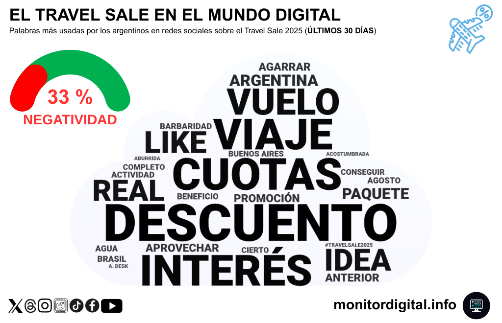 El medidor de sentimiento marca 33% de negatividad, un porcentaje relativamente bajo que expresa el humor de los argentinos hablando sobre la promoción de ventas de paquetes turísticos.