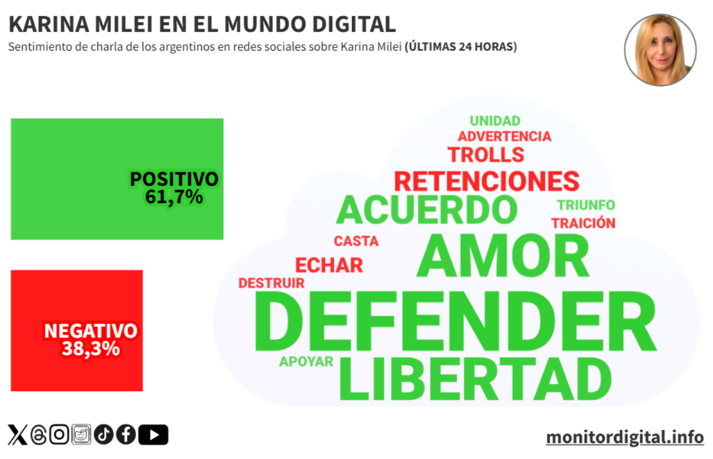 De hecho, en el análisis del sentimiento de la charla de los argentinos sobre Karina Milei en las posteriores a su publicación muestra una tendencia a la positivización de la conversación que menciona a la hermana presidencial.