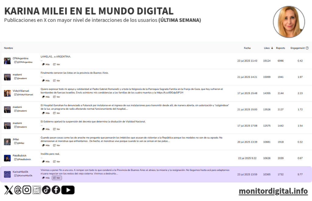 Comparando la publicación de la hermana presidencial en X con otros posteos de los dirigentes políticos más importantes de la Argentina, logra ubicarse entre los 10 con más interacciones de la última semana, algo inédito para la persona más cercana y de más confianza del presidente Javier Milei.