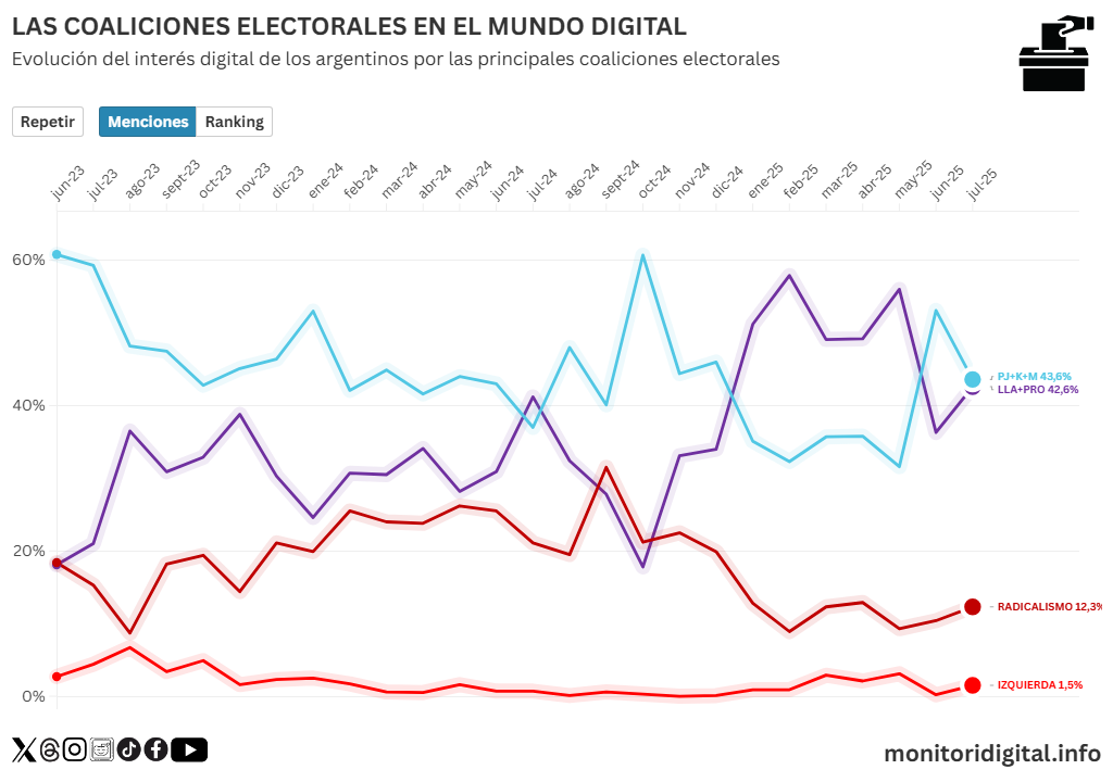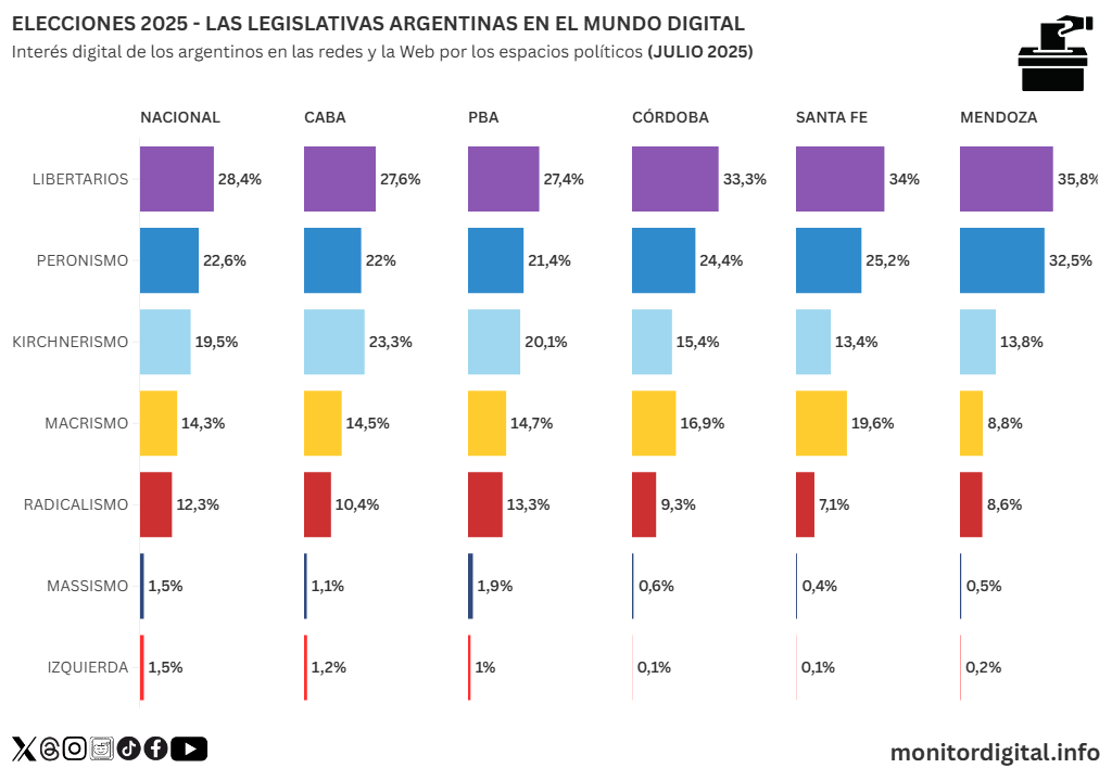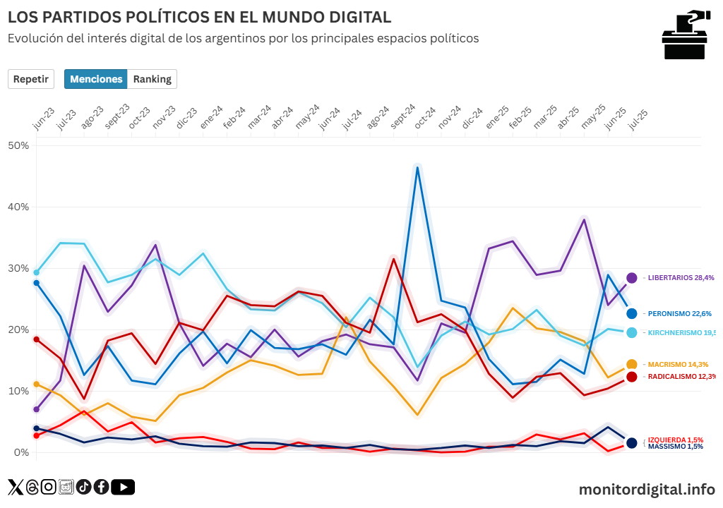 Sin embargo, el peronismo (22,6%) y kirchnerismo (19,5%) muestran que el bloque peron-kirchnerista todavía concentra una porción importante del interés digital, aunque fragmentado.