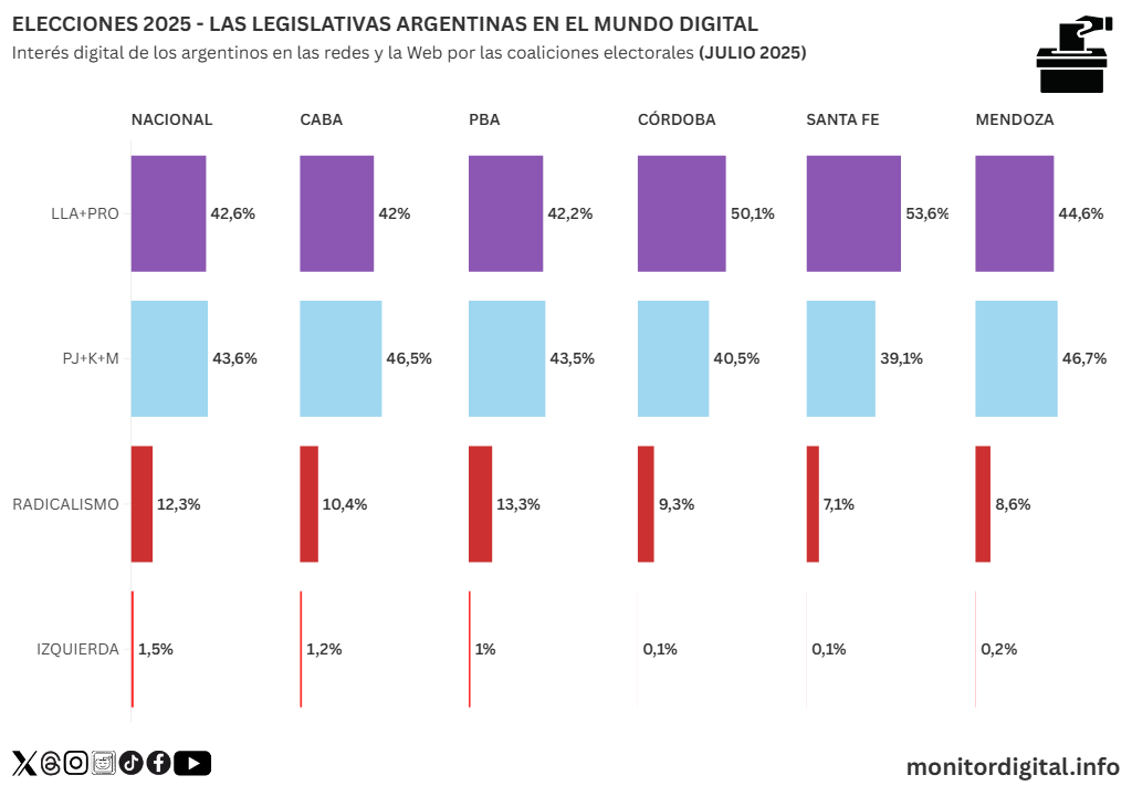 En cambio, en Mendoza, La Libertad Avanza + el Pro se imponen con mucha comodidad con casi el 45% del interés digital, en Córdoba con algo más del 50% y en Santa Fe con más del 53%.