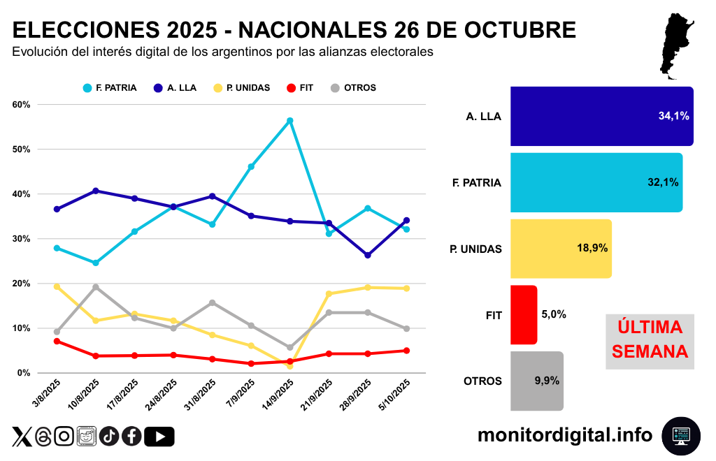 Durante las últimas semanas, La Libertad Avanza (34,1%) y Fuerza Patria (32,1%) concentraron más de dos tercios del interés digital total.