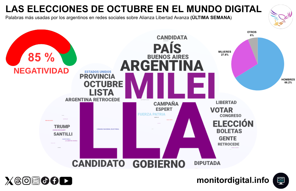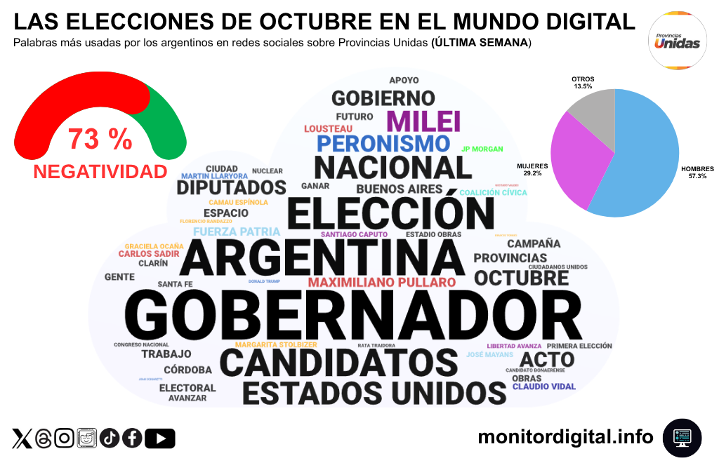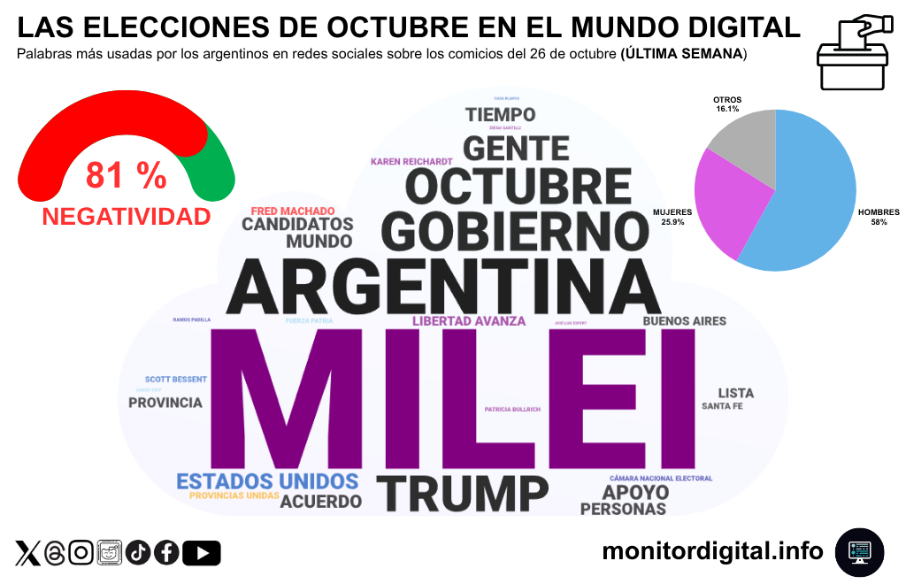 Según el monitoreo de redes sociales argentinas realizado por Monitor Digital, el 81% de las menciones vinculadas al proceso electoral tuvo tono negativo, evidenciando un escenario de polarización, escepticismo y fatiga colectiva frente a la política.