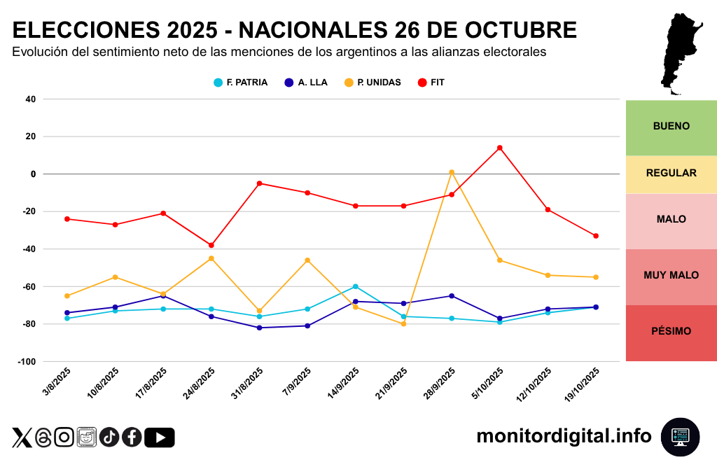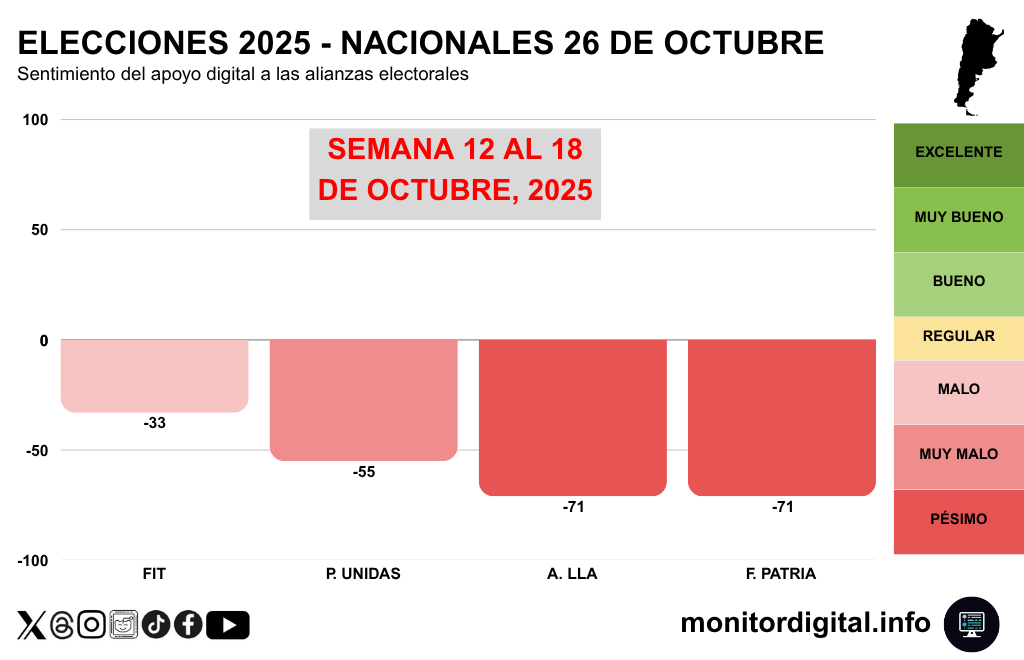 Durante la semana del 12 al 18 de octubre, el monitoreo digital de Monitor Digital registró una profundización del clima de malestar político en redes sociales argentinas.