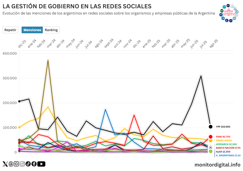 YPF se consolida como la empresa pública con mayor volumen de conversación digital: más de 1,4 millones de menciones entre diciembre de 2023 y agosto de 2025.