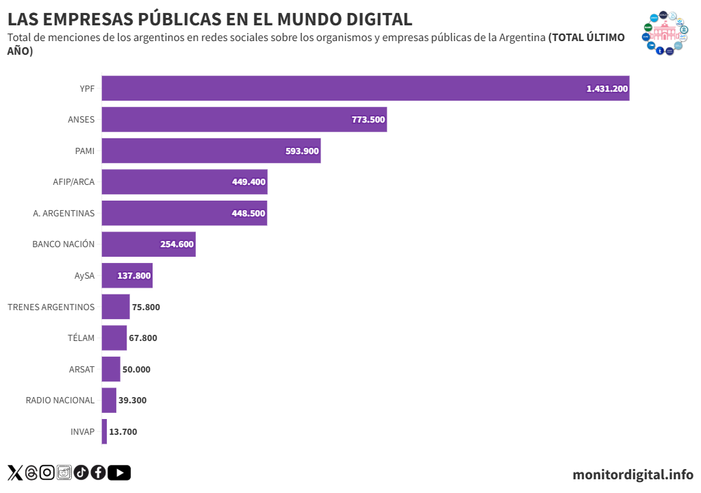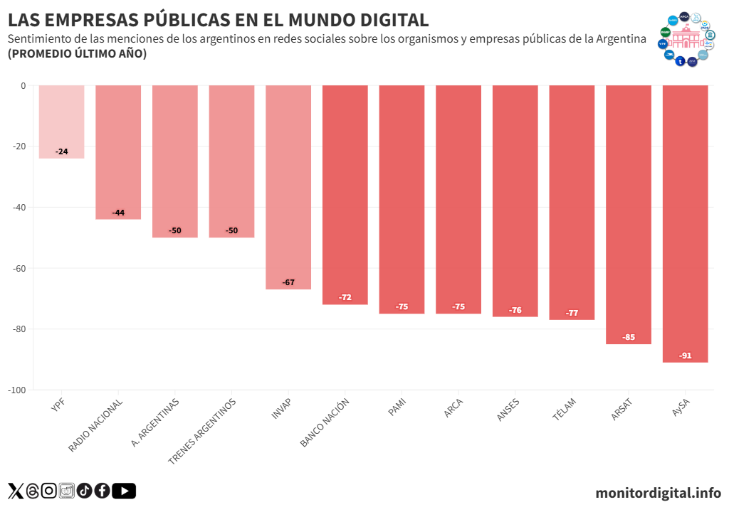 YPF, ANSES, PAMI y AFIP lideran en volumen de menciones, mientras que AySA y Télam se ubican entre las más cuestionadas en términos de percepción digital de los argentinos en redes sociales.