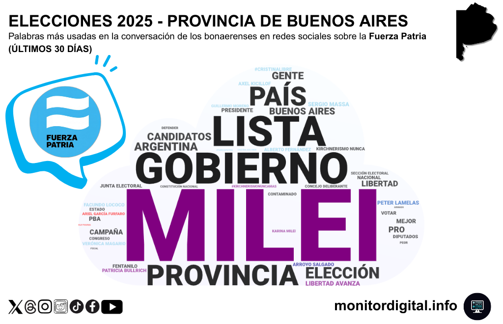 En la conversación digital bonaerense sobre Fuerza Patria en los últimos 30 días se observan rasgos muy particulares que ayudan a entender su crecimiento en interés, con apellido del presidente Javier Milei en el centro de la conversación política.