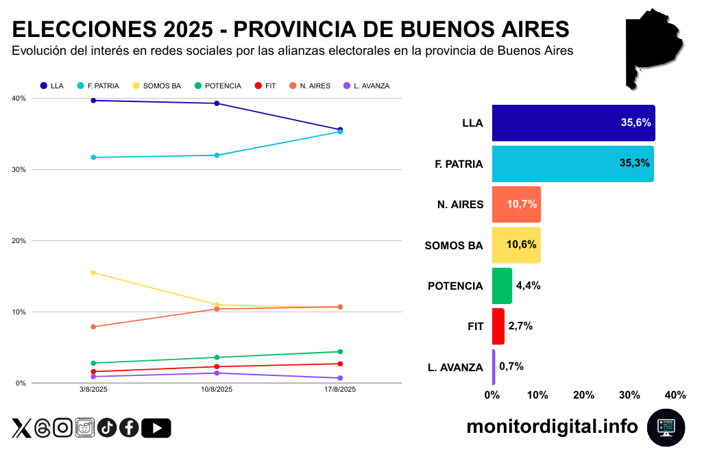 - El interés digital bonaerense está concentrado en estas dos fuerzas, con una narrativa que puede definirse semana a semana según los avatares de la campaña electoral..