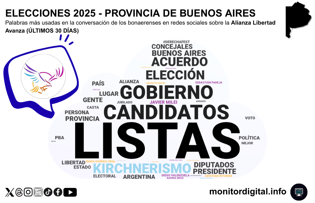 En la conversación digital bonaerense sobre la Alianza Libertad Avanza (LLA), que integra a libertarios y sectores del macrismo, se destacan varios elementos clave, con la centralidad puesta en las negociaciones para conformar las listas de candidatos a legisladores provinciales: