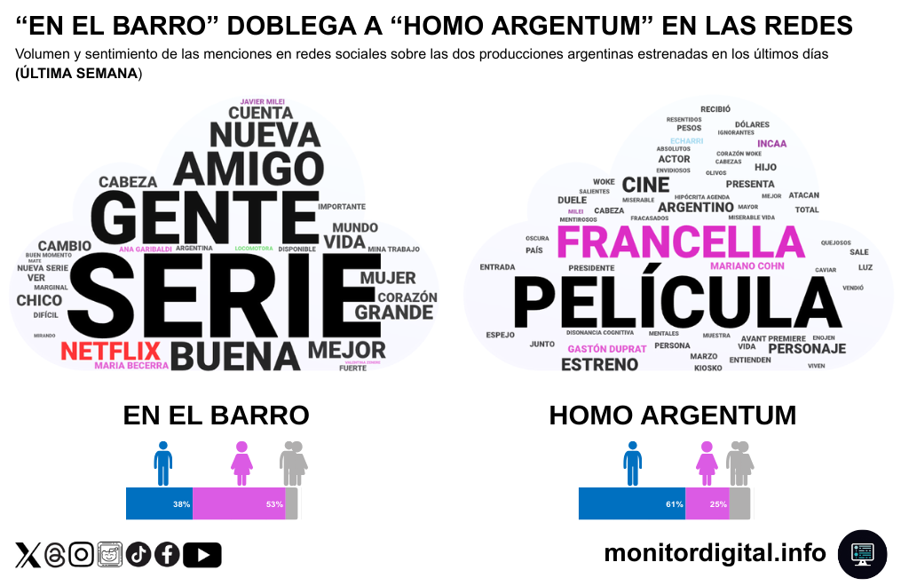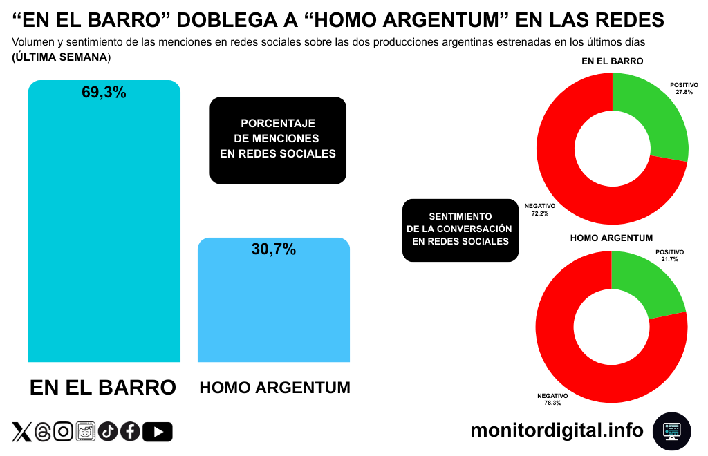 De acuerdo con los datos de Monitor Digital, En el Barro concentró el 69,3% de las menciones en redes, más del doble que Homo Argentum (30,7%).