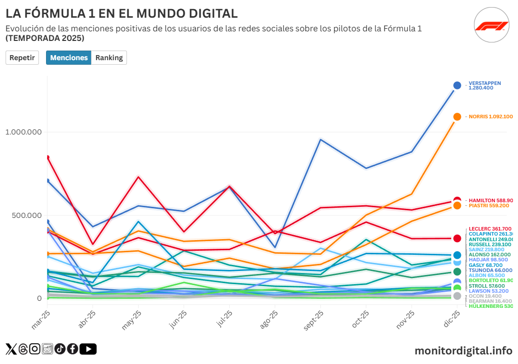 El tercer escalón del podio digital lo ocupó el propio campeón, Norris, con 4,56 millones de menciones y una curva muy clara: volumen medio en el primer semestre y despegue fuerte en el último tramo, con más de 500.000 menciones en octubre, 628.400 en noviembre y 1,09 millón en diciembre, cuando el título ya se discutía en clave épica.