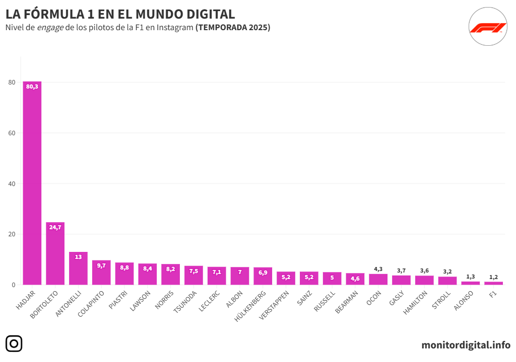 - Max Verstappen quedó a mitad de tabla en engage (5,2) y sumó 2,5% de nuevos seguidores; en valores absolutos, incorporó algo más de 4 millones, hasta superar los 17,9 millones.