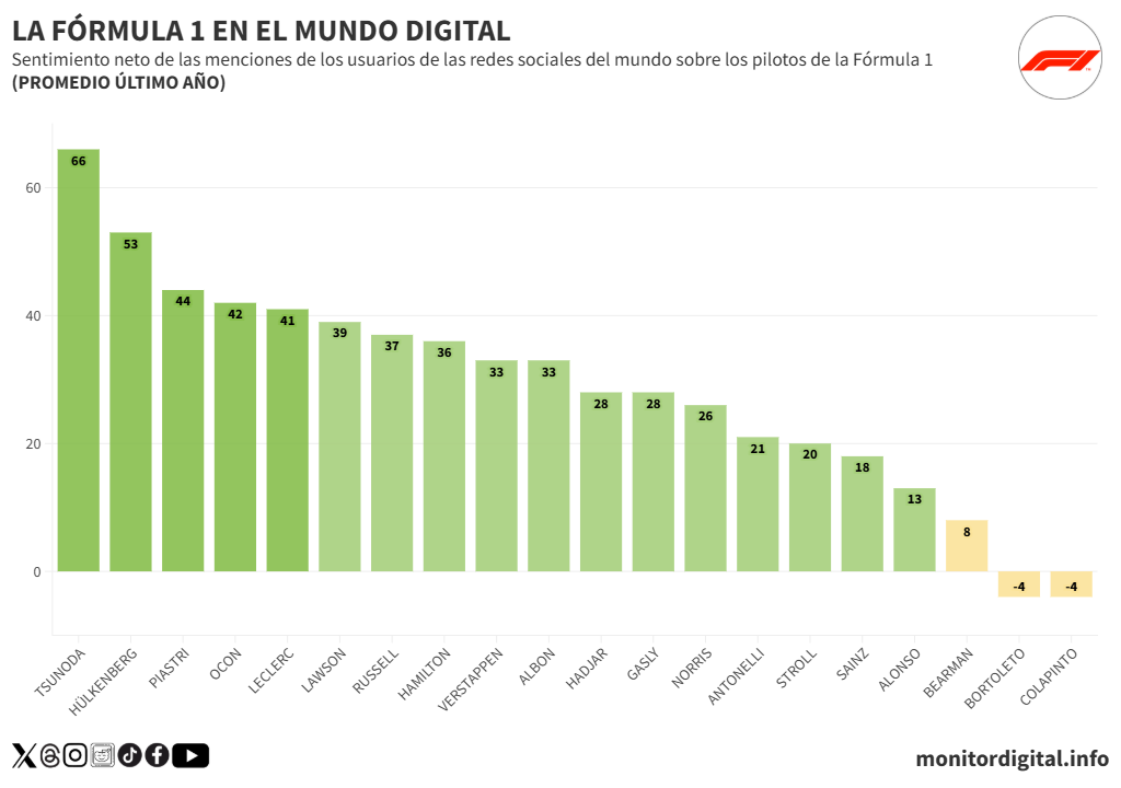 Gasly y Hadjar también quedaron en esa franja de “queridos con reservas”, mientras que el campeón deportivo Lando Norris terminó con un NSR +21: saldo positivo, pero sin la adoración digital que suelen imaginar las campañas de marketing.