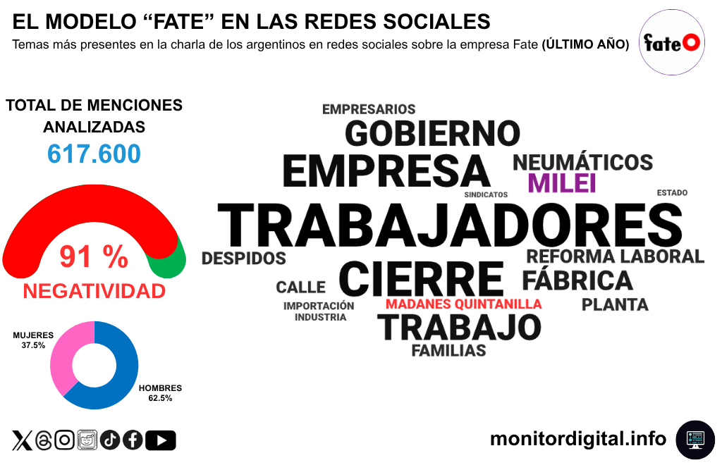 Con 140.400 menciones y un saldo de sentimiento de -63 puntos NSR, la marca circula en redes dentro de una atmósfera menos ligada al conflicto laboral y más conectada con el lenguaje de la producción y la competitividad.
