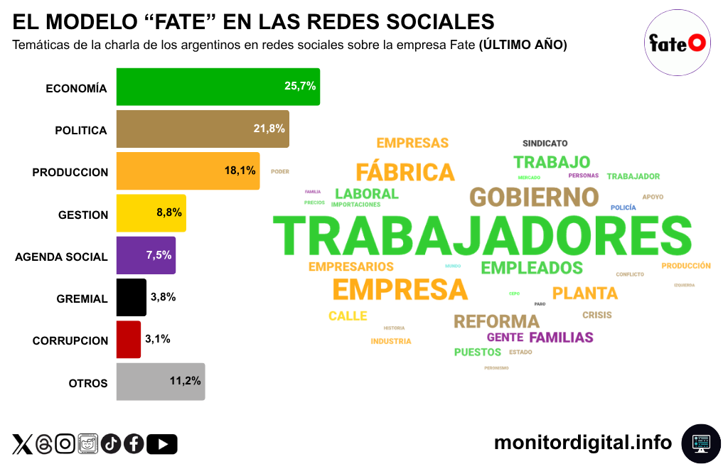 En Fate predominan Economía (25,7%), Política (21,8%) y Producción (18,1%), seguidas por Gestión (8,8%), Agenda social (7,5%), Gremial (3,8%) y Corrupción (3,1%).