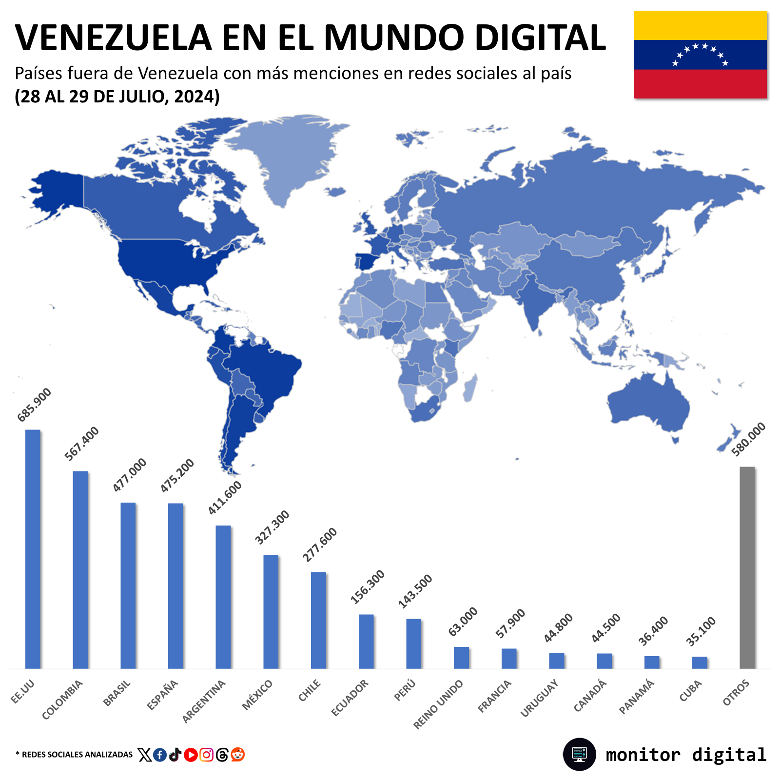 A nivel mundial, Estados Unidos, Colombia y Brasil dominan las menciones a las polémicas elecciones en Venezuela, celebradas el domingo 28 de julio.