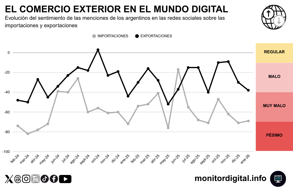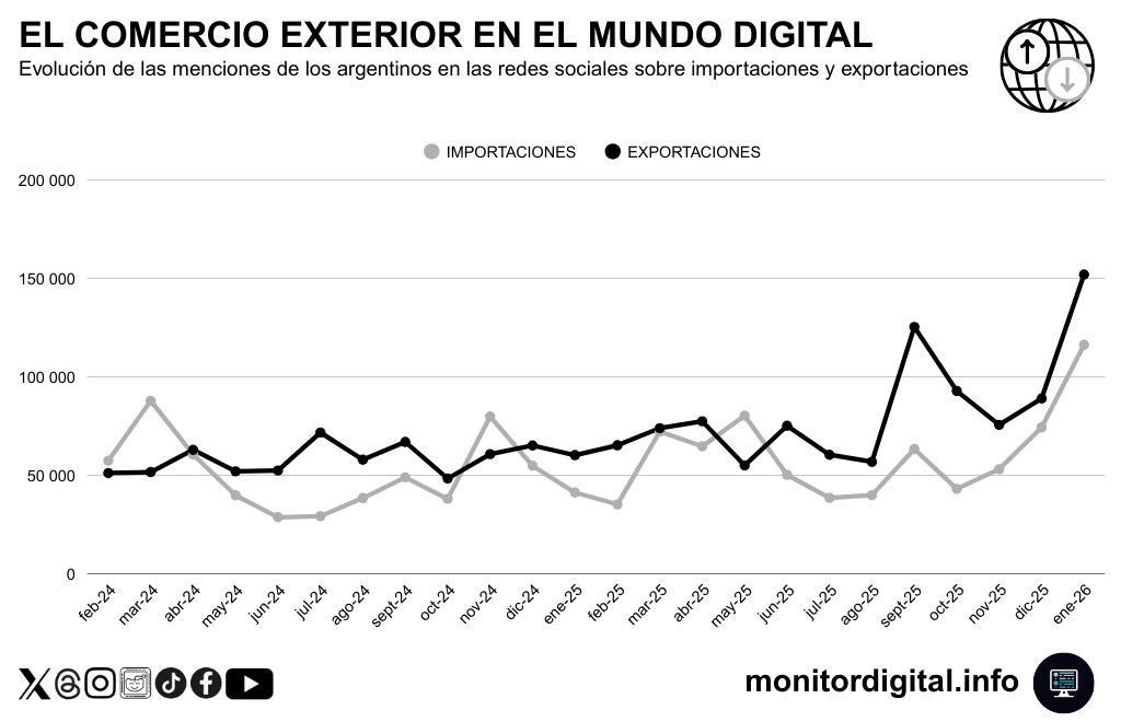 La curva comparada de menciones en redes sociales sobre importaciones y exportaciones (feb-24 a ene-26) mostró una dinámica simple de leer y difícil de domesticar: la conversación no subió de manera lineal, sino por saltos.