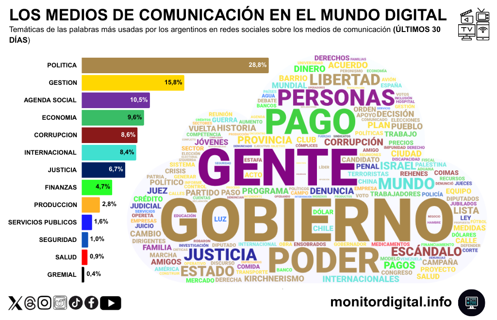La política domina con fuerza la conversación en las redes argentinas sobre los medios: 28,8% de las menciones refieren a temas de rosca y poder.