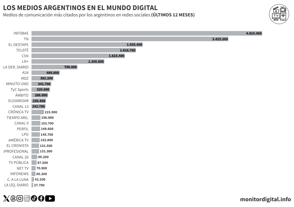 En términos de protagonismo, Infobae lidera con 1,68 millones de menciones durante el último año, seguido por Clarín (1,53 millones) y La Nación+ (504.800).