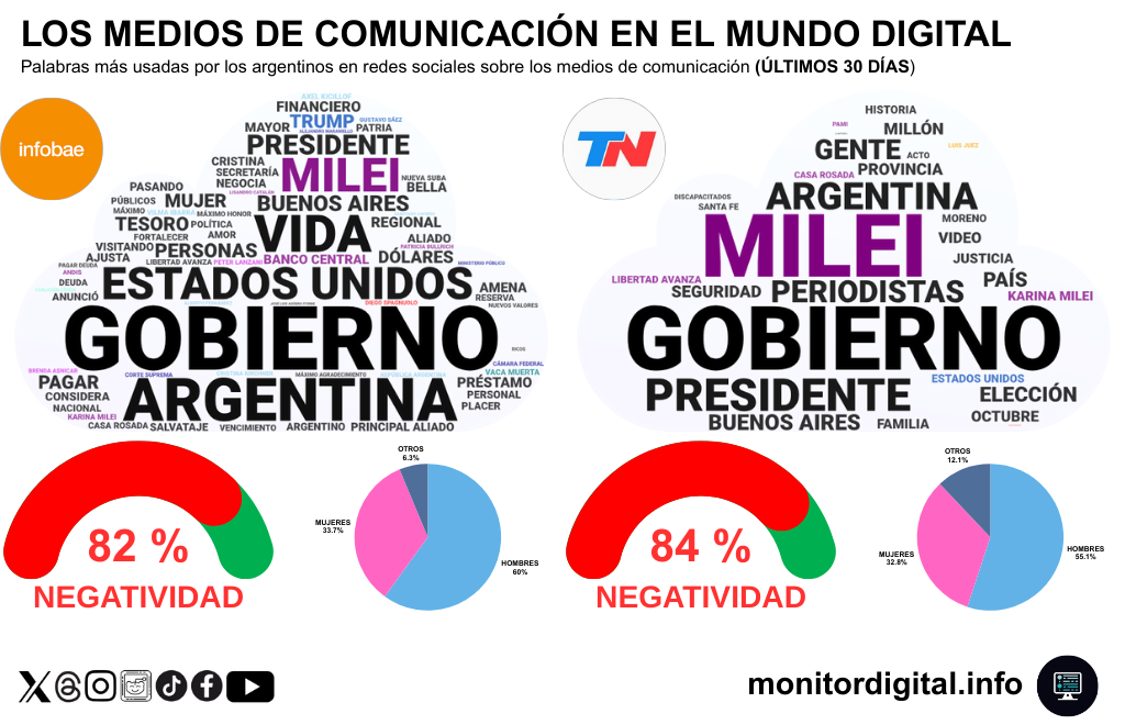 El análisis individual de la conversación en redes sociales sobre Infobae y Todo Noticias (TN) confirma el patrón general de la conversación digital: gran protagonismo, pero bajo un clima de negatividad estructural.