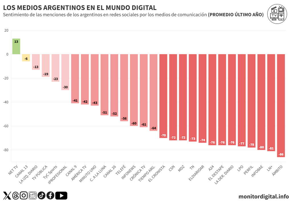 - Clarín, Infobae, TN, América TV y A24 aparecen sistemáticamente en terreno negativo.