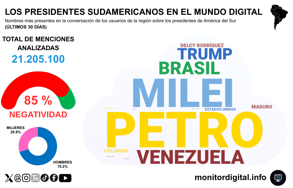 La conversación regional de las redes sociales de América del Sur dejó durante los últimos 30 días un total de 21.205.100 menciones, en un clima de muy alta negatividad: 85%.