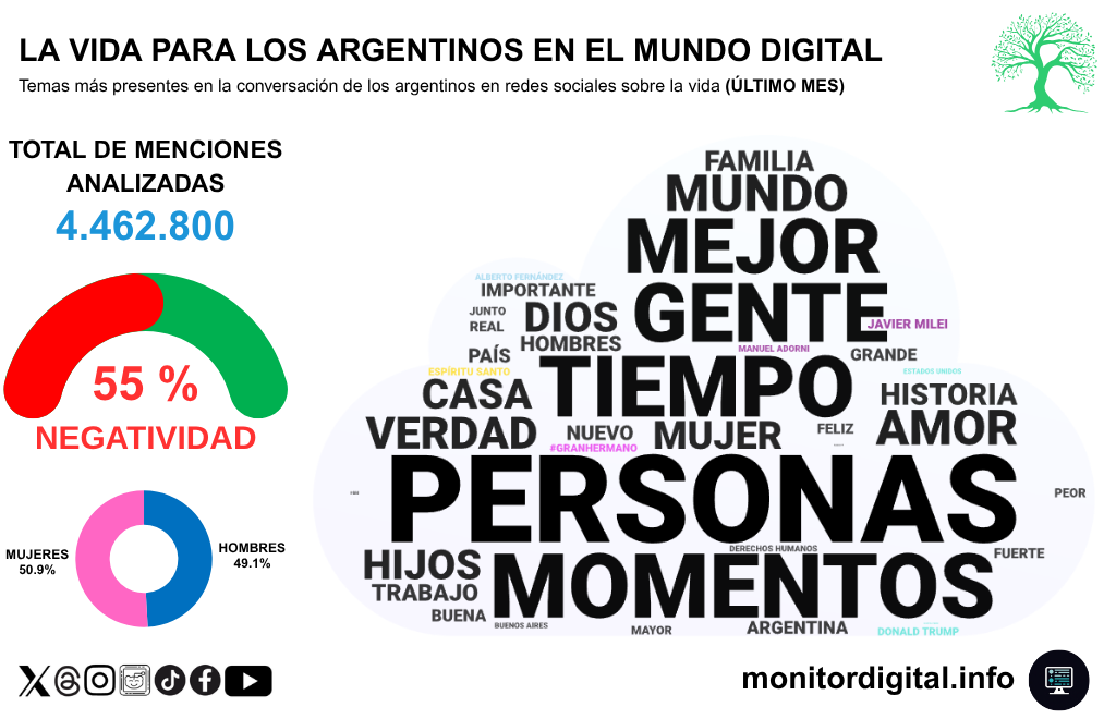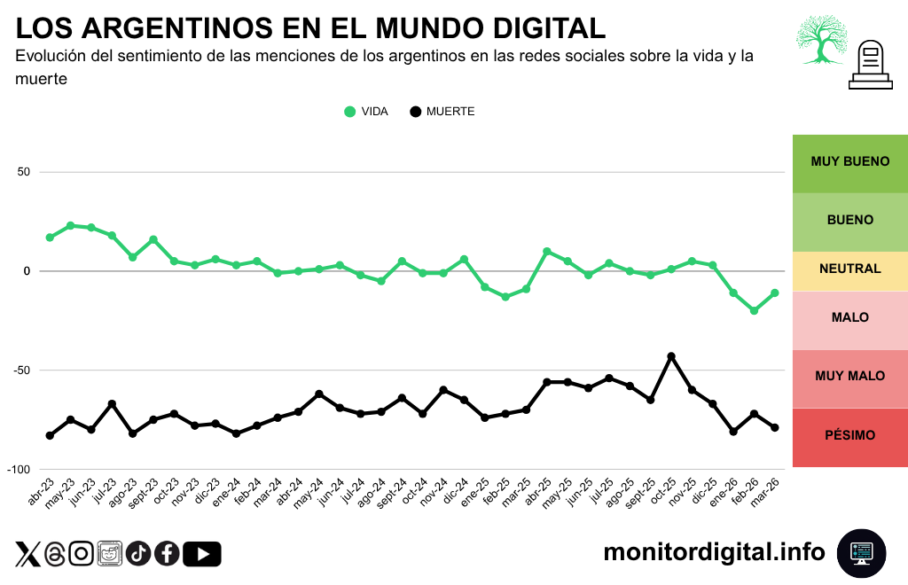 La conversación sobre la vida en las redes sociales argentinas pega un salto todavía más grande en volumen que la muerte: en marzo de 2026 alcanza 4.462.800 menciones, muy por encima de los registros de marzo de 2023, 2024 y 2025, aunque su estructura semántica sugiere otra lógica.