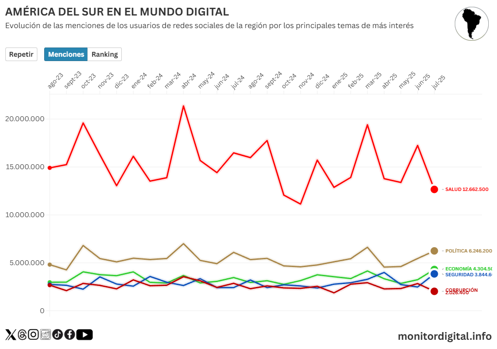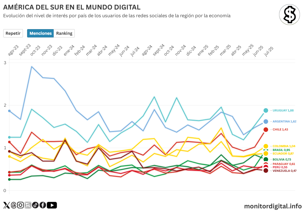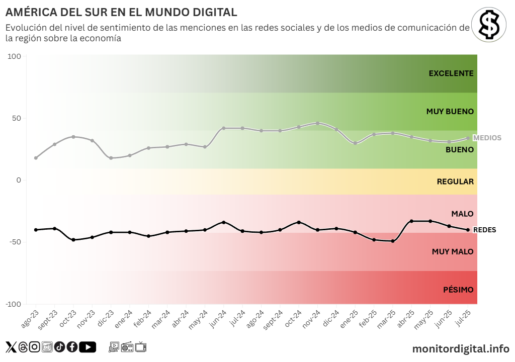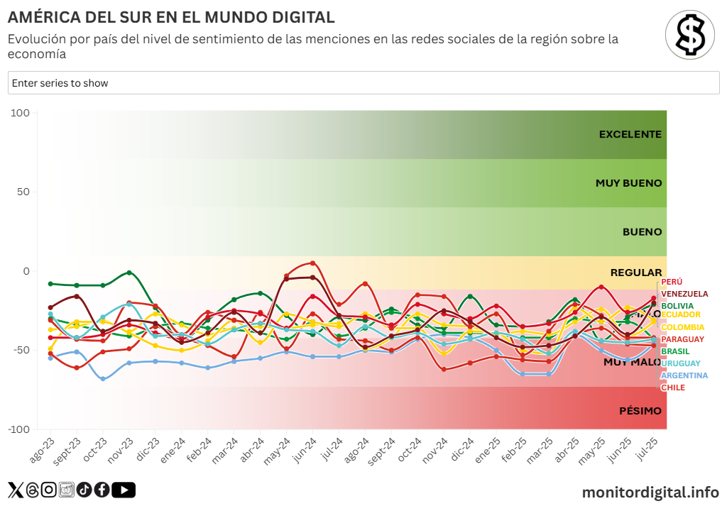 Si bien la economía no es el tema con más ruido, marca un pulso constante en la conversación digital sudamericana.