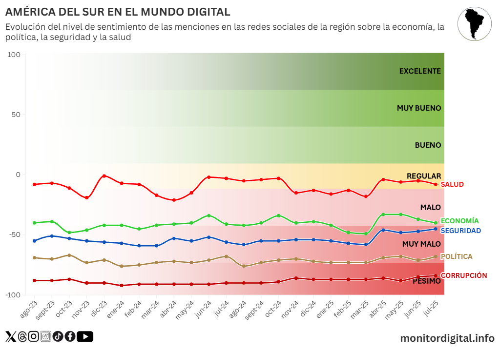 En síntesis: el mapa sudamericano de conversación digital sobre la gestión muestra que la economía no está sola como fuente de tensión, sino que se inserta en un ecosistema de malestar generalizado, donde política y corrupción profundizan la desconfianza y la hostilidad ciudadana.