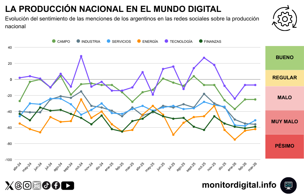 Si bien varios rubros de la conversación productiva en redes sociales recuperaron algo de positividad entre febrero y marzo de este año, los promedios siguen por debajo de los alcanzados en meses anteriores.