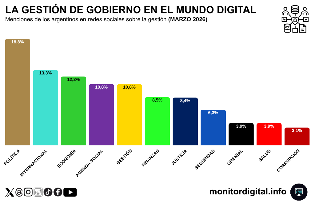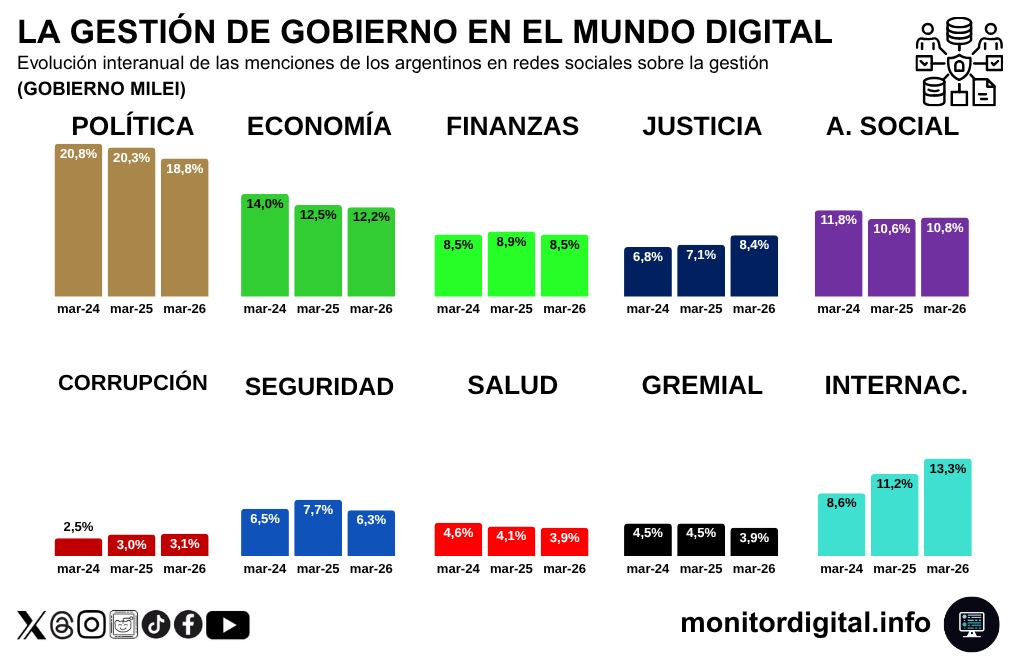 La categoría Política se ubica primera con 18,8% de las menciones sobre la gestión pública en las redes sociales, pero Internacional llega a 13,3% y queda por encima de Economía (12,2%), Agenda Social (10,8%) y Gestión (10,8%).