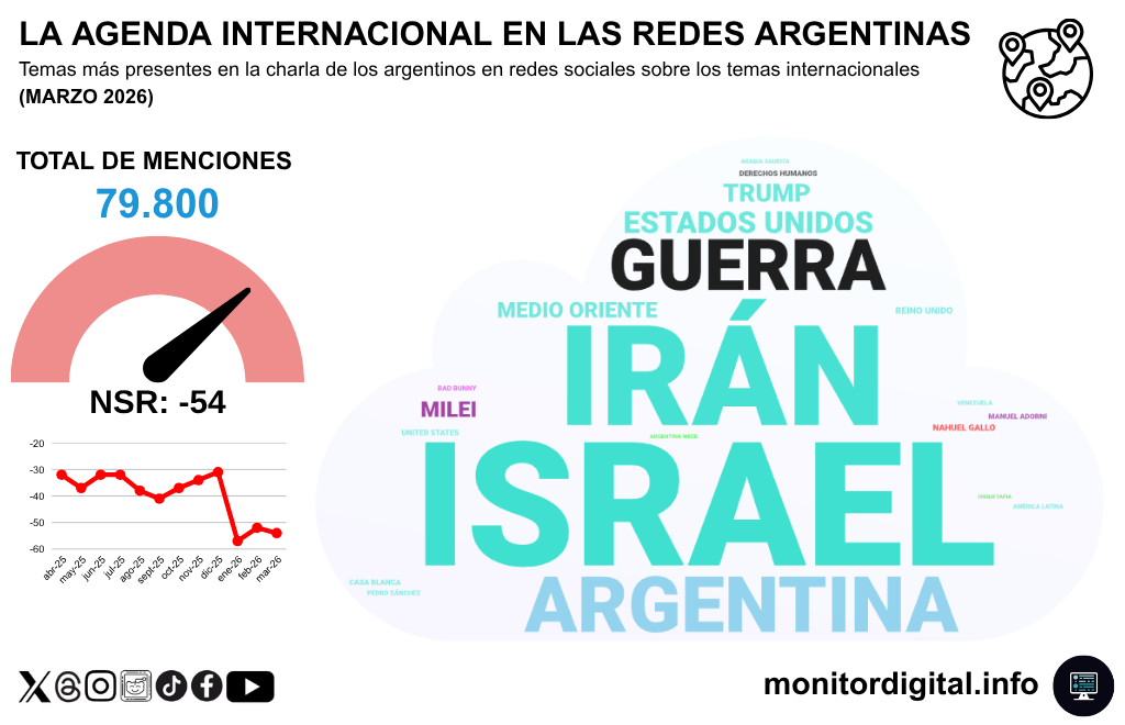Marzo terminó de consolidar esa tendencia: la guerra en Irán domina la charla sobre asuntos internacionales y arma una nube semántica donde sobresalen Israel, Irán, guerra, Estados Unidos y la Argentina.