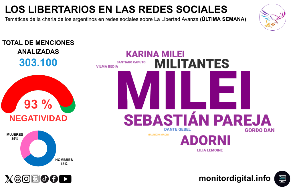 En el caso de La Libertad Avanza, el volumen semanal de menciones en redes sociales asciende a 303.100 menciones analizadas, con 93% de negatividad.