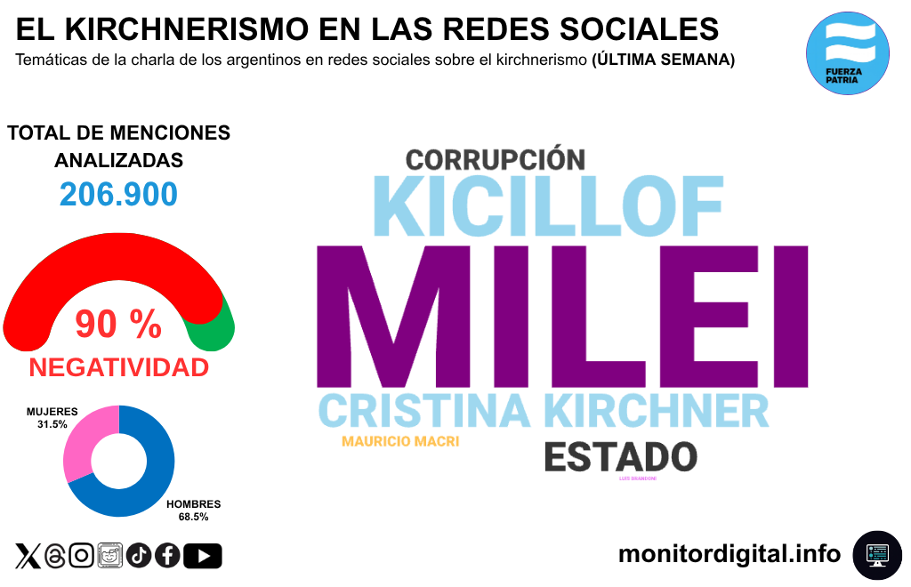 La conversación sobre el kirchnerismo reúne 206.900 menciones analizadas y exhibe 90% de negatividad.