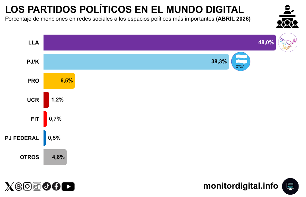 - LLA y PJ/K concentran casi toda la atención política digital. El sistema partidario en redes está hoy hegemonizado por esos dos espacios.
