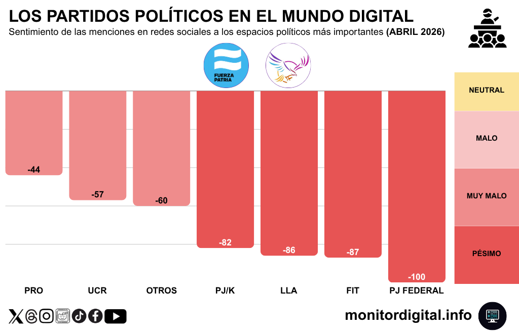 La Libertad Avanza registra -86 puntos NSR (Net Sentiment Ratio) y el PJ/K -82 puntos, ambos en zona de rechazo severo.