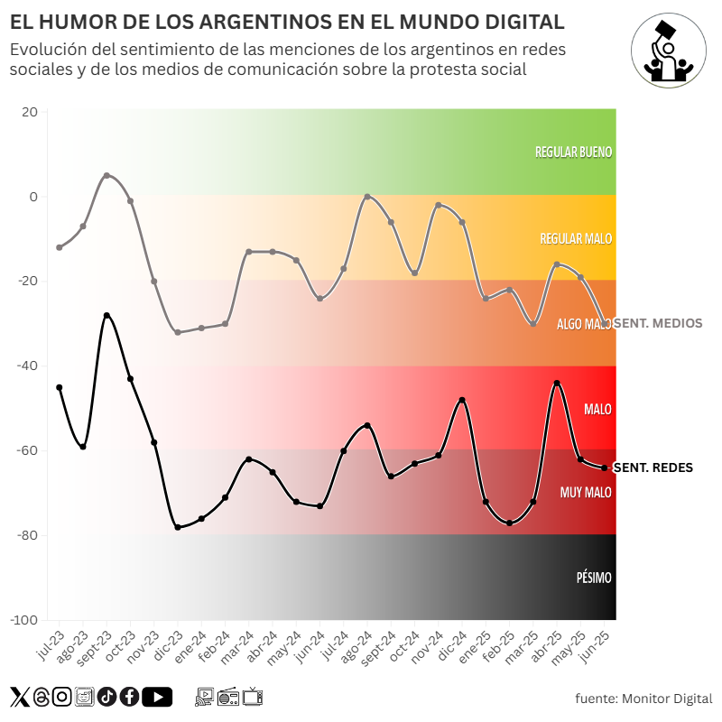 En cambio, en redes sociales, se fue registrando una progresiva mejora del clima de las publicaciones de los argentinos a lo largo de la gestión de Javier Milei, pero con un marcado retroceso a partir de 2025, con recuperación momentánea en abril que se revirtió de manera preocupante entre mayo y junio.