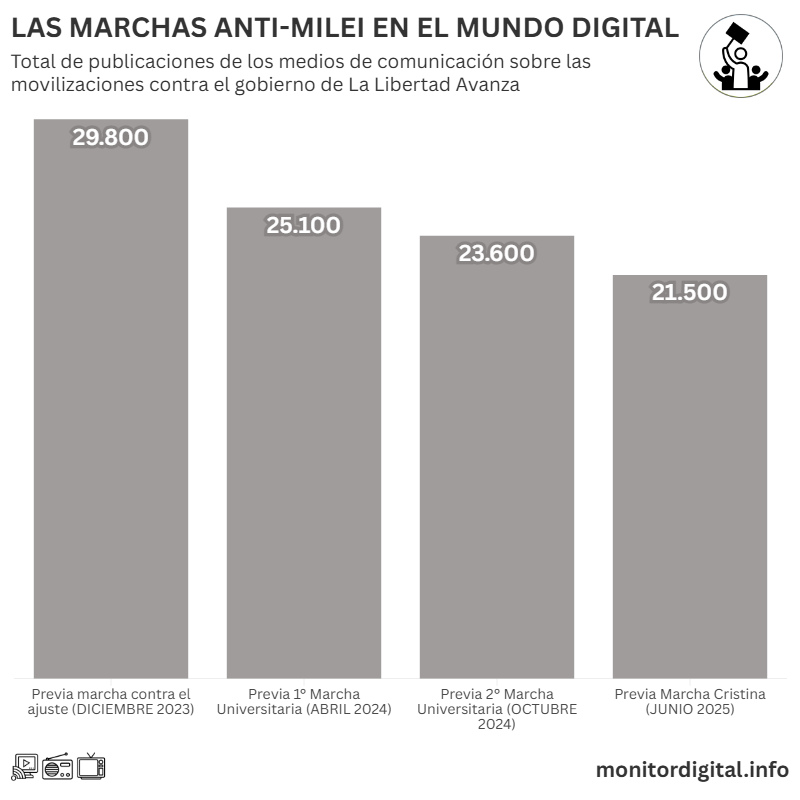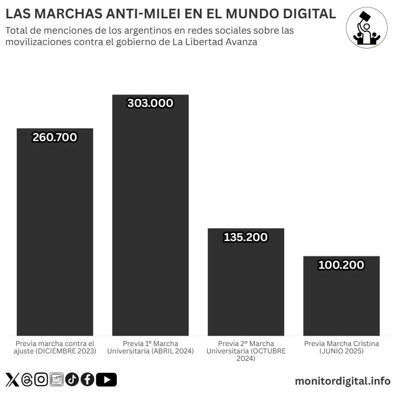 La cifra es similar, aunque algo más baja, al volumen de menciones generadas durante la Marcha Universitaria de octubre de 2024, la segunda marcha en defensa de la educación pública realizada durante el gobierno de Javier Milei.