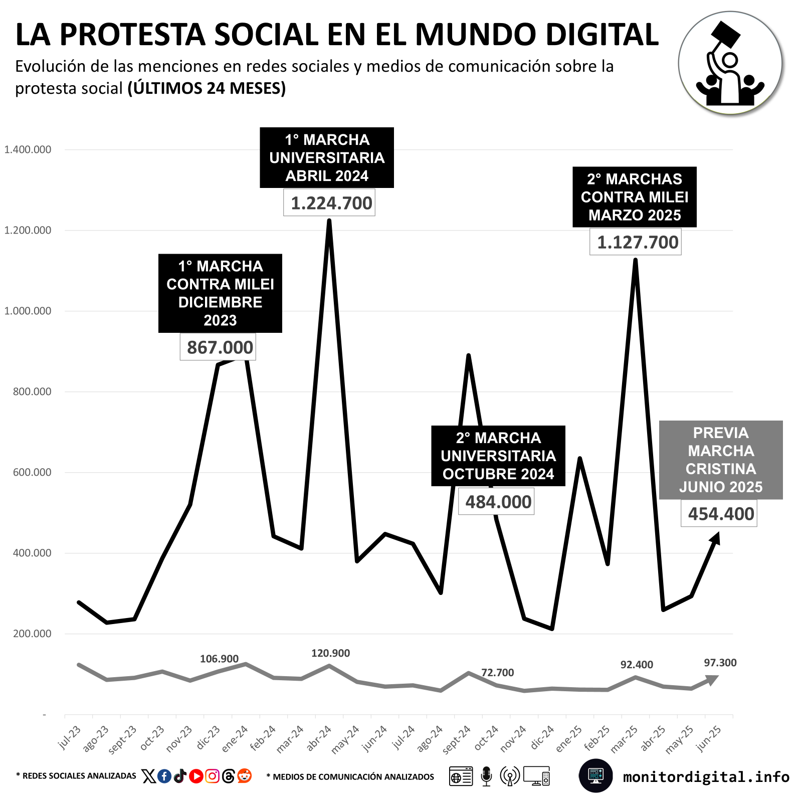 En los acumulados mensuales, la convocatoria se ubica entre las cinco expresiones callejeras con más presencia en la conversación pública, desde diciembre de 2023.