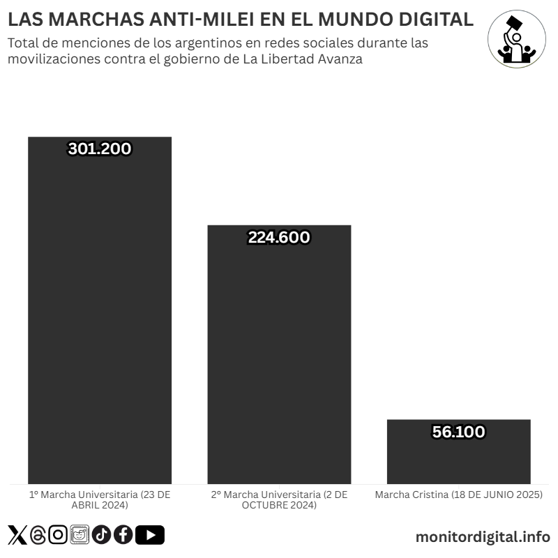 Comparada con las dos marchas universitarias, la movilización del 18 de junio en defensas de la condenada expresidenta logró un 75% menos de menciones en plataformas sociales con respecto a la movilización del 2 de octubre de 2024.