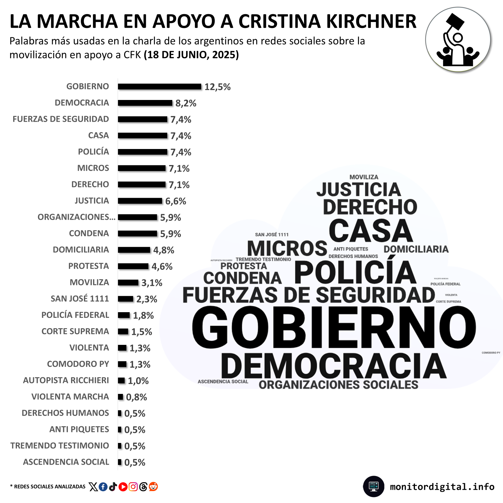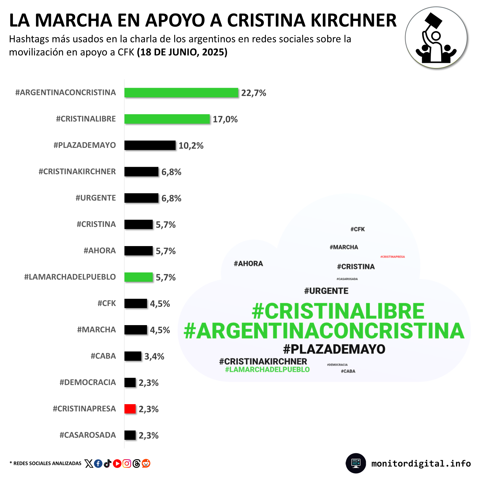 En el análisis de los apoyos detectados en la conversación pública durante la movilización en apoyo a Cristina Kirchner a Plaza de Mayo, predominaron los hashtags de respaldo a la exmandataria de parte de la militancia digital del kirchnerismo en redes sociales.