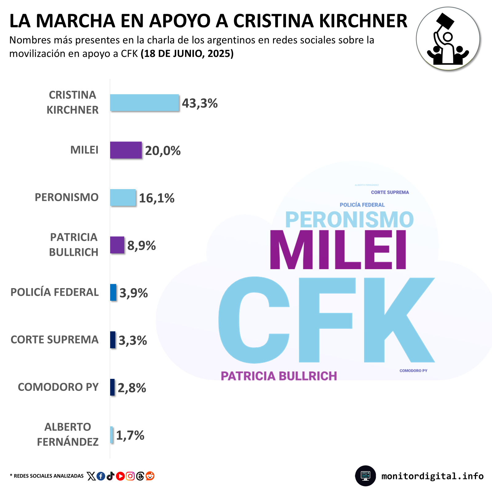En cuanto a los nombres propios más presentes durante el día de la movilización a Plaza de Mayo, detrás del de Cristina Kirchner (con algo más del 43% del total de menciones) asoma el apellido de Javier Milei.